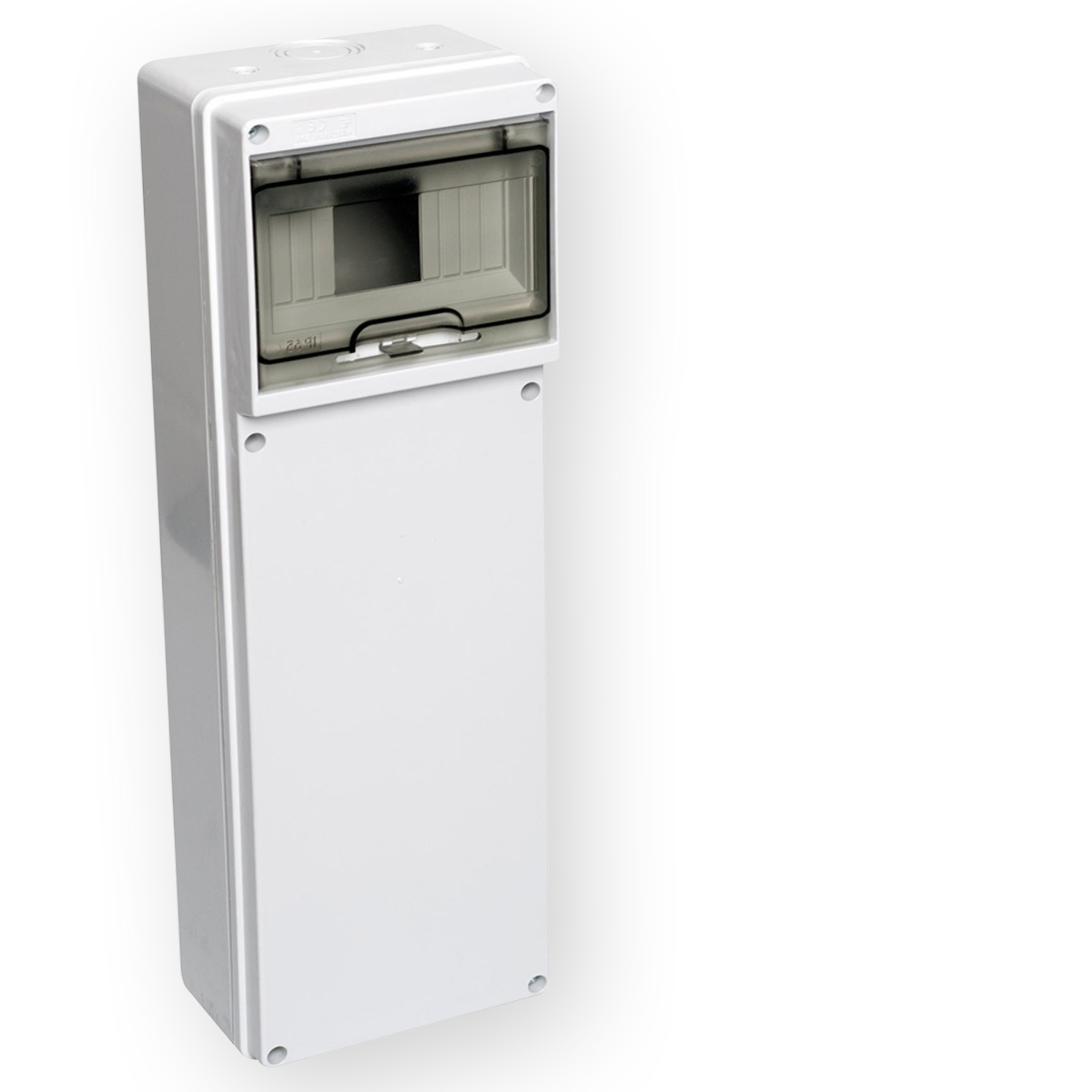 Compacte wandverdeler voor vaste wandmontage. Slagvaste behuizing van hoogwaardige ABS-kunststof met transparante, slagvaste polycarbonaat afdekking. Afmeting van deze wandverdeler zijn 440x135x95mm.